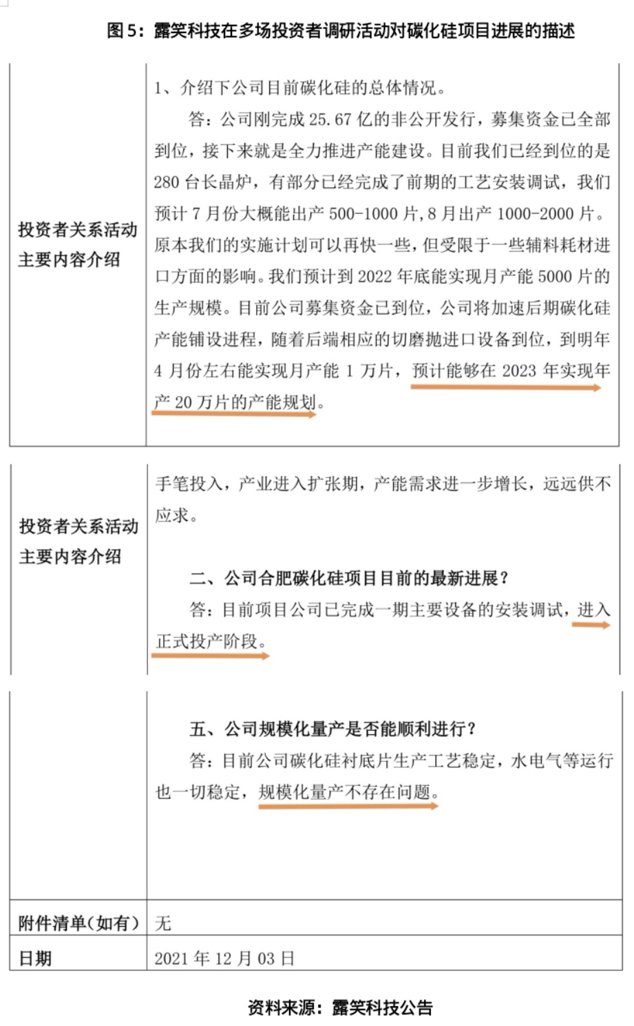 为撑合手这一广博遐想,露笑科技2021年定向增发募资25.67亿元,其中19.40亿元明确投向合肥碳化硅神态。2021年以来,露笑科技更是在多场投资者调研步履中合手续开释积极信号,频频说起“产能扩大”“认真投产”“限度化量产不存在问题”,不竭推高阛阓对其转型告成的预期。