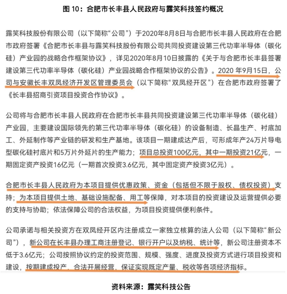 回溯露笑科技的碳化硅布局,源流充满设想空间。2020年起,国内第三代半导体产业迎来政策密集扶合手的“黄金窗口期”,从“新式基础设施缔造三年步履筹划”到处所半导体产业专项补贴,政策红利合手续开释。就在这一年,以漆包线业务为中枢的露笑科技陡然跨界,与合肥市长丰县东说念主民政府签约共建第三代功率半导体(碳化硅)产业园,神态投资额高达100亿元。