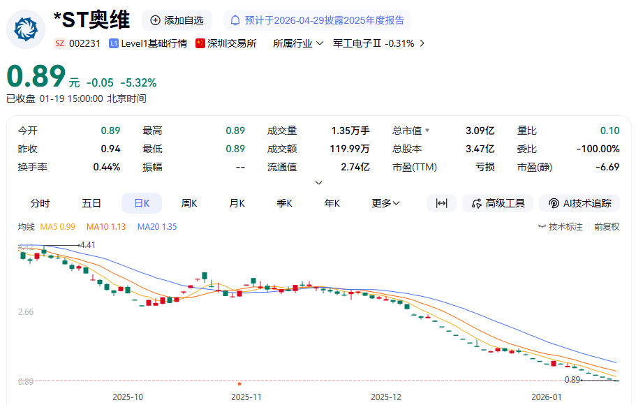 1月19日,*ST奥维(002231)再度跌停,逼迫收盘,该股报收0.89元/股,总市值为3.09亿元,已长入12个交游日低于5亿元。据此蓄意,即使以前8个交游日逐日涨停,其总市值也难以回升至5亿元,提前锁定市值退市。