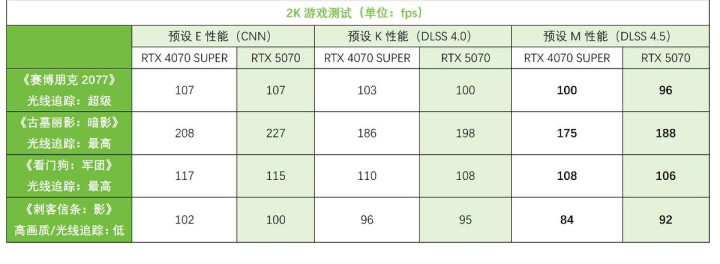 比较专门念念的是,RTX 4070 SUPER和RTX 5070两款显卡的显存王人是12GB,2K辩别率下基本不错摈斥“爆显存”的影响。在这个前提下,搭载新一代Tensor Core的RTX 5070开启DLSS 4.5后的效能施展险些和RTX 4070 SUPER是一致的,相等于40系显卡不错“无痛”相沿DLSS 4.5。