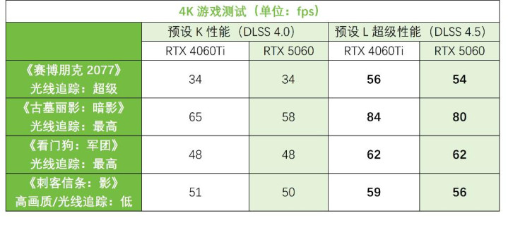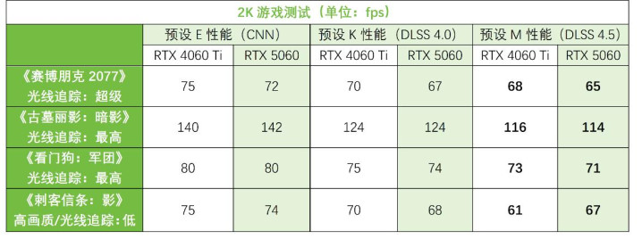 4K游戏测试中,澳门新浦京游戏下载咱们莫得专门去对比DLSS 4.5和传统CNN模子的效能施展,而是和DLSS 4.0进行对比。不错看到。不管是RTX 4060 Ti照旧RTX 5060,使用预设L超等性能形状(DLSS 4.5)的游戏帧率王人要比预设K性能形状(DLSS 4.0)更高,两款卡的平均帧率擢升王人在34%以上。