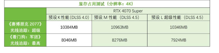 终末,咱们还测试了DLSS 4.5的显存占用。在通常的性能形状下,DLSS 4.5的显存占用要比DLSS 4.0高小数,不外使用超等性能形状的话,由于需要渲染的原生像素更少,是以显存占用也更少。如果使用RTX 4060Ti和RTX 5060这种8GB显存的显卡,开启DLSS 4.5后可能需要保重到显存占用的情况来调遣游戏殊效,12GB显存以上的显卡,不错忽略DLSS 4.5带来的显存占用加多。