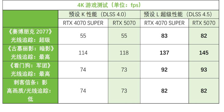 4K游戏辩别率下,RTX 4070 SUPER使用预设L超等性能形状的游戏帧率平均比预设K性能形状高27%摆布,RTX 5070使用预设L超等性能形状的游戏帧率平均比预设K性能形状高28%摆布。其中《赛博一又克2077》,在预设K性能形状下两款显卡的帧率王人是55fps,使用预设L超等性能形状帧率不错达到80fps以上,擢升照旧很大。