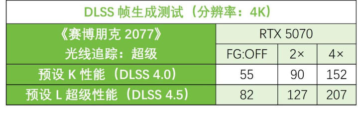 比较缺憾的是,当今DLSS 4.5的6×帧生成形状还莫得预防通达,最高只可到4×帧生成。咱们使用RTX 5070显卡,在4K游戏辩别率下,进行多帧生成测试。不错看到,预设L超等性能形状(DLSS 4.5)在2×帧生成下就达到了120fps以上的帧率,2×帧生成下摧残200fps,远超预设K性能形状(DLSS 4.0)。