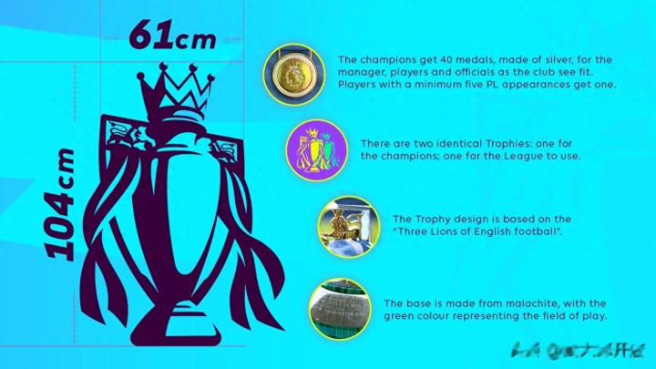 英超奖杯高104厘米,宽61厘米,质地是25.4千克。其中刻有冠军的底座分量是15.9千克,是由孔雀石制成,其中的绿色是代表这绿茵场。其中奖杯上的狮子是代表着英格兰足球的“狮子”形象,英格兰国度队外号是“三狮军团”。
