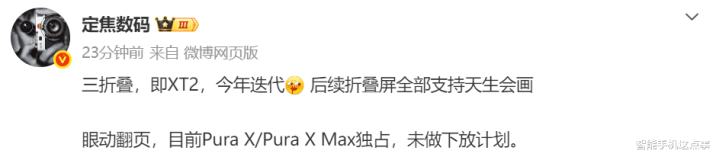 最近,对于华为折叠屏居品线的几条新音问接连流出,三折叠Mate XT2阐述本年迭代,后续折叠屏将全面复旧天生会画,而眼动翻页功能持续在Pura X系列独占,莫得下放探讨。