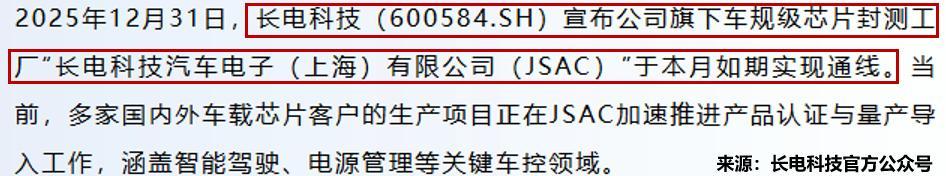 2025年12月31日,长电科技文书,其车规级芯片封测工场已于12月按时终了通线。