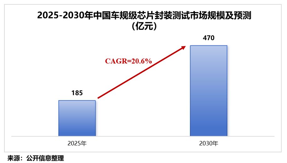数据炫耀,2025年,中国车规级芯片封装测试商场范畴约185亿元;瞻望到2030年将攀升至470亿元,年均复合增长率高达20.6%。