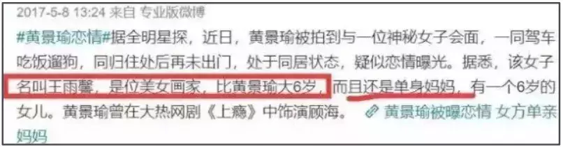 黄景瑜和张艺上在2017年因为勾通《为了你我欢腾可爱通盘这个词寰宇》意志,由于两东说念主片场互动过于综合传出绯闻,比如黄景瑜让张艺上玩她的手,远超出了一般一又友关系。尔后,狗仔卓伟爆料黄景瑜已婚,还拍到了他与单亲姆妈王雨馨同框约聚的画面,而他与张艺上的绯闻在其时并未掀翻海潮。