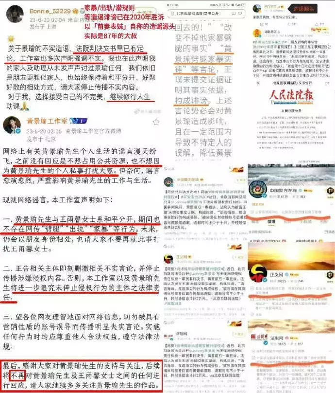 2019年,黄景瑜告了替王雨馨发声的“凸凹抵拒”,否定家暴等指控,法院判赢。王雨馨也发文表通盘皆是假的,看起来两方息争了。然则,在这之后的数年,王雨馨和黄景瑜的拉扯并莫得适度,王雨馨频频常撕一下黄景瑜。终于在2023年,黄景瑜承认了这段婚配的存在,王雨馨也发文线路家东说念主、助理等从未声讨黄景瑜,强调黄景瑜商酌争议法院已有判决。