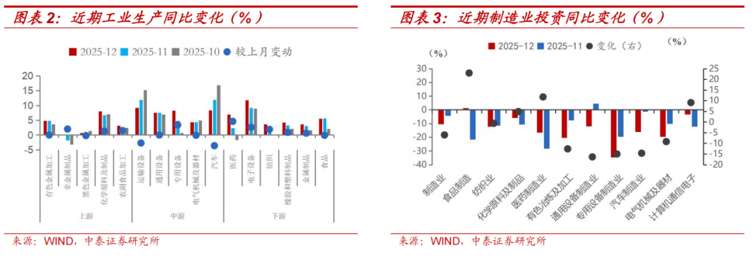工业出产中,12月制造业出产改善明显,采矿业增速回落。采矿业、制造业和水电燃气供应业同比增速分歧为5.4%、5.7%和0.8%,分歧较上月-0.9pct、+1.1pct和-3.5pct。